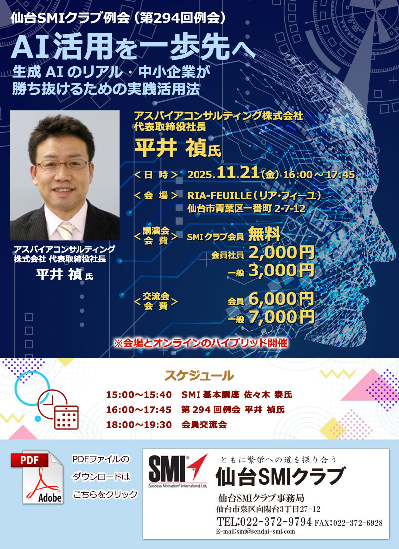 【講演会会費】仙台SMIクラブ会員 無料/会員社員2,000円/一般3,000円